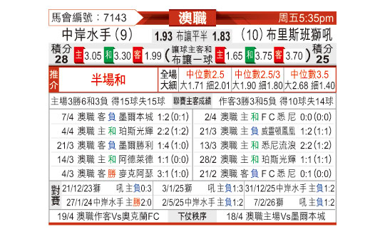 [澳超] 中央海岸水手vs布里斯班狮吼